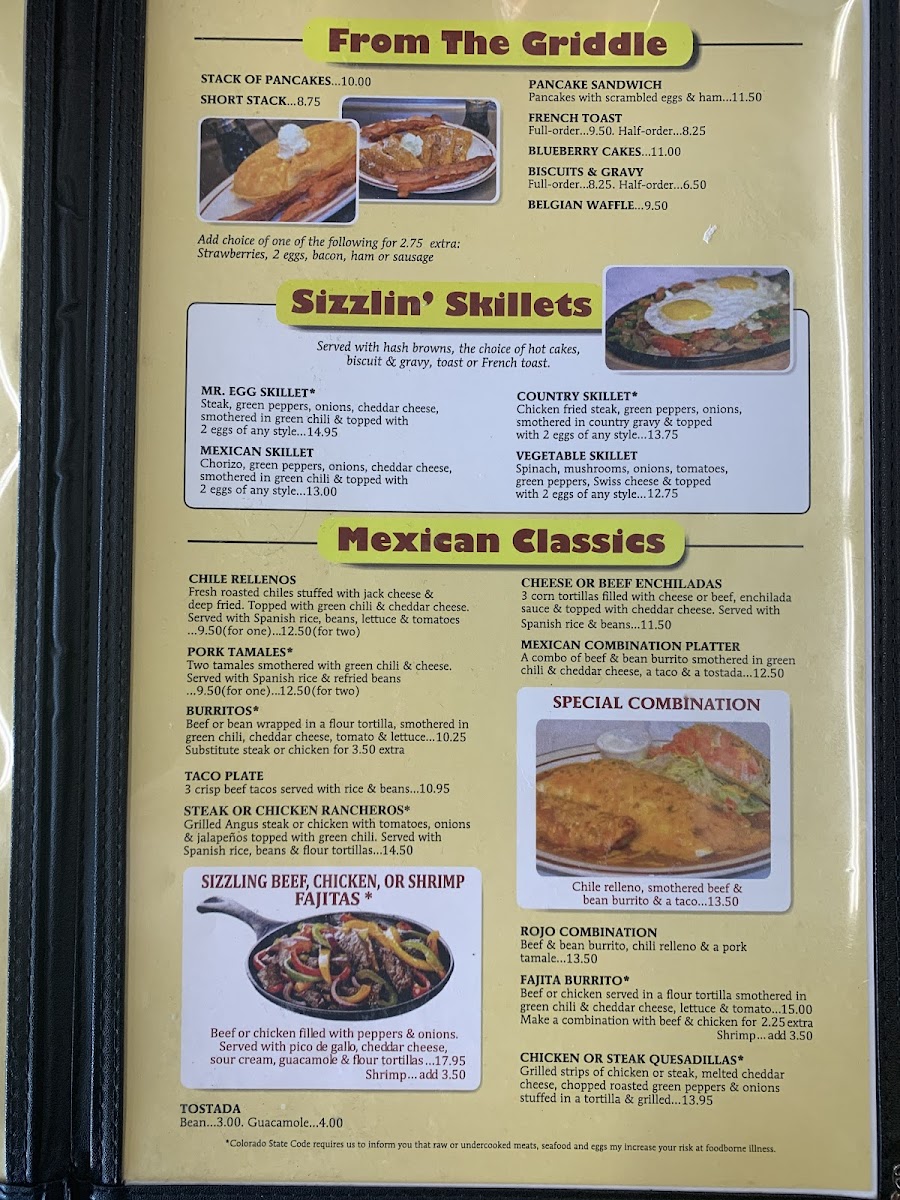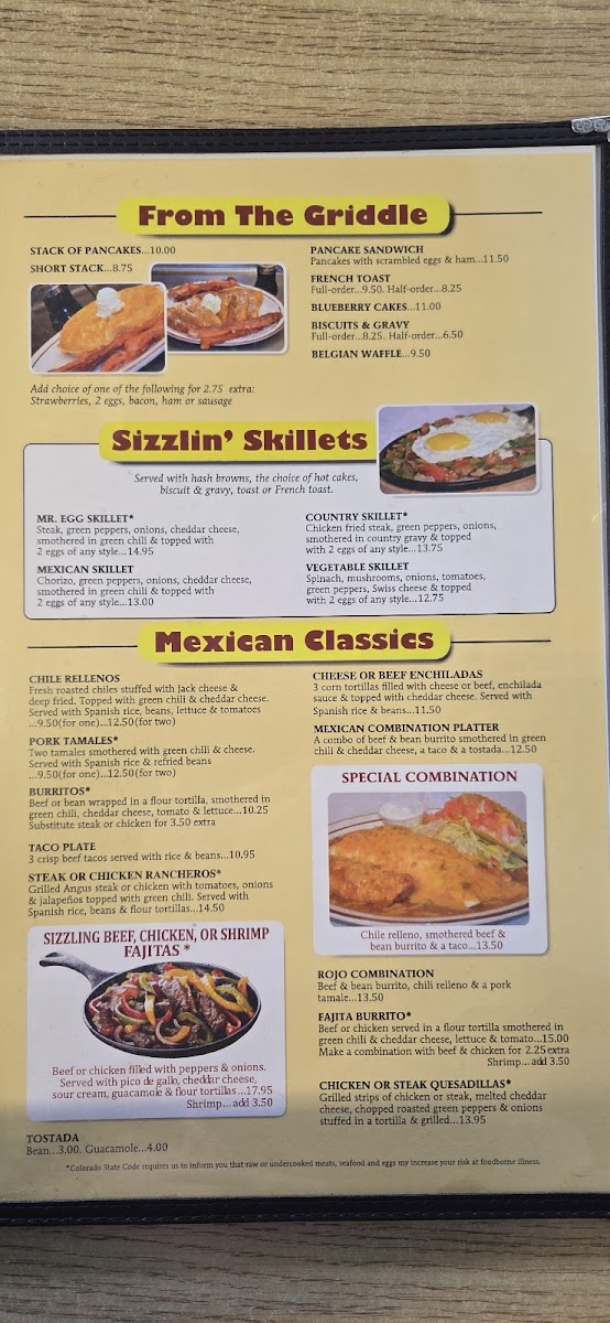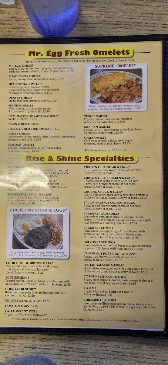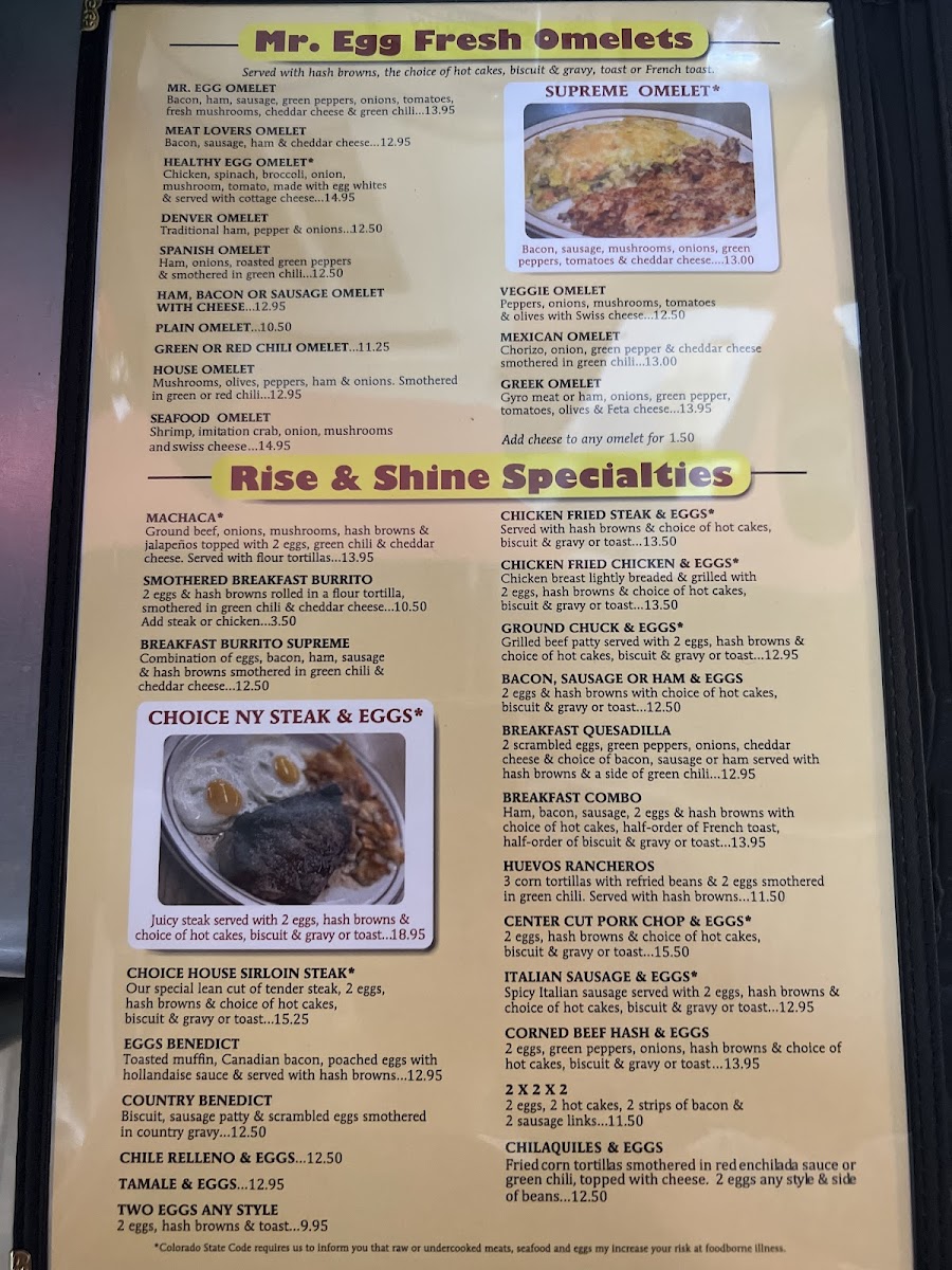 Omelets and Breakfast Entrees offer a variety of combinations featuring ingredients such as bacon, ham, sausage, green peppers, onions, mushrooms, and cheeses. Notable dishes include the Meat Lovers Omelet and the Mr Egg Omelet, each served with a choice of sides like hot cakes, biscuit and gravy, or toast. Other highlighted breakfast items include burritos, chilaquiles, chile relleno, pancakes, and shakshuka-style dishes, appealing to those seeking hearty or regionally inspired breakfast options.